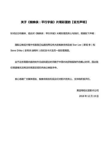 12月19日,美国索尼哥伦比亚电影公司在微博发布声明,确认《蜘蛛侠:平行宇宙》中国内地版删掉了两个片尾彩蛋。声明表示,内地版的彩蛋被删除,是因为两个彩蛋的制作完成和提交时间晚于内地译制版制作的截止时间