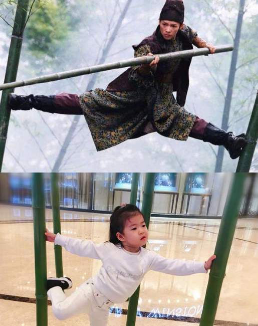 照片中醒宝穿着白色毛衣和白色裤子,站在两根绿色柱子间,两手抓着柱子,一只脚抬起,与章子怡放出的曾经自己在《十面埋伏》中的劈叉踩着两根竹子的扮相意外撞款。