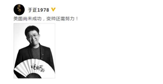 近日,有网友晒出于正的自拍照和他拍照,并称其是一个P图鬼才,对瘦脸磨皮和尖下巴有一种执念。12月21日,于正晒出一张手拿折扇的照片,发文回应此事:“美图尚未成功,变帅还需努力!&rdquo