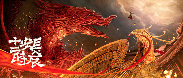 超级剧集《长安十二时辰》在2018年的最后一周发布了“龙跃凤鸣”版海报。海报中一条龙和一只凤分居画面两侧。该海报中的“龙凤”来自于《长安十二时辰》的美术设计手稿,故事发生在上元佳节,长安西市花灯繁盛,“龙跃凤鸣”的花灯设计,展现了龙凤呈祥的好意兆,祥瑞喜庆的气息浓郁,画面中的龙和由竹木制作而成的巨型灯架,上有点点花灯,照亮了夜色下的长安城,也暗示了这座长安城在上元佳节下的暗流汹涌和危机四伏。盛世长安将迎来末日之劫,靖安司司丞李泌和死囚张小敬需要在短短的十二个时辰里,探案破解狼卫的阴谋,拯救长安城百姓。