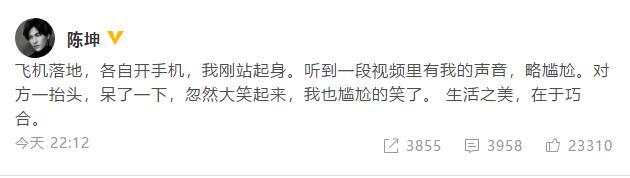 12月27日晚,陈坤通过微博回应被叫错名字,写道:“飞机落地,各自开手机,我刚站起身。听到一段视频里有我的声音,略尴尬。对方一抬头,呆了一下,忽然大笑起来,我也尴尬的笑了。生活之美,在于巧合。”