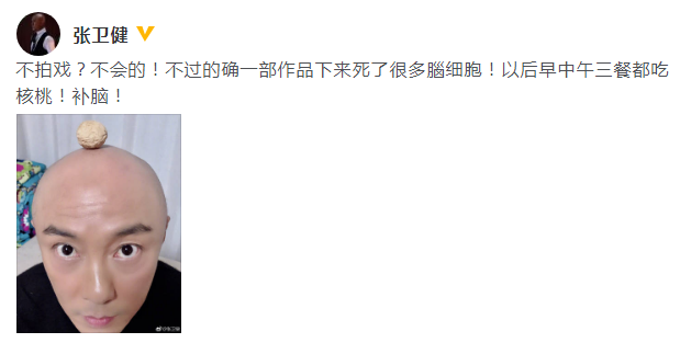 12月27日,张卫健发文回应“不再拍剧”:“不拍戏?不会的!不过的确一部作品下来死了很多脑细胞!以后早中午三餐都吃核桃!补脑! ”