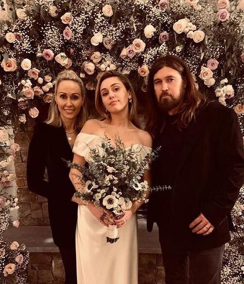12月27日,麦莉·塞勒斯的妈妈蒂什在社交网上晒出一家三口在女儿和利亚姆·海姆斯沃斯婚礼上的合影。