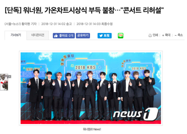 另外,Wanna One方相关人士爆料,为了准备即将在1月24日起展开的演唱会,他们确定不参加1月23日的2019 GAONCHART K-POP Awards。若以此推算,Wanna One 1月最后公开行程应为1月15日首尔歌谣大赏。