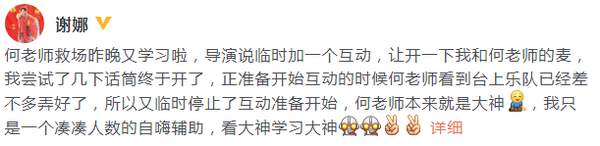 1月1日早,谢娜回应了晚会上的小插曲,解释了事情发生的缘由称:“昨晚又学习啦,导演说临时加一个互动,让开一下我和何老师的麦,我尝试了几下话筒终于开了,正准备开始互动的时候何老师看到台上乐队已经差不多弄好了,所以又临时停止了互动准备开始。”还称赞:“何老师本来就是大神”,谦虚表示:“我只是一个凑凑人数的自嗨辅助,看大神学习大神”。