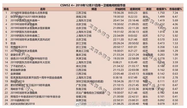 2019年跨年演唱会cms52收视率统计出炉1月1日,2019年跨年演唱会cms52收视率统计出炉。江苏卫视以1.750的收视率夺第一,超过了连续蝉联5年第一的湖南卫视。值得注意的是,除cms52统计