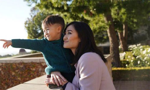 照片中,妻子李安琪抱着儿子站在高处,母子两人迎着阳光,面带笑意,弟弟更是伸出右手直指前方,气势十足。