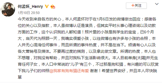 1月10日晚,曾被传是张柏芝三胎生父的何孟怀发文否认蹭张柏芝热度,称:“照片里的小孩是我学生的宝宝,已6个月大,当天代为照顾一天,我确实很爱小孩,以往微博也有许多与小孩的合照,本人并无心混淆任何事件,而且所谓的事件热度,并不是在当下。烦请有心人不要再过度的揣测,以及拿此做文章。所谓的热度,本人也不想蹭,对我没有帮助,并且对我私下生活影响很大。本人目前单身,并无生育任何子女,本人口中常说的儿子有三个,不过那是狗和猫,希望世界安好,并且本人尽快脱单。”