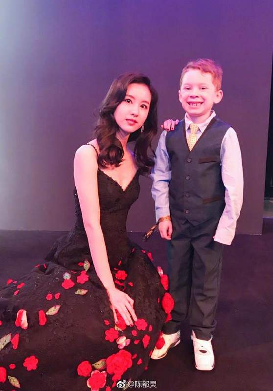 照片中,Thomas穿着白皮鞋小西装,露出标志性“假笑”,十分可爱,而陈都灵穿着黑色碎花礼服,坐在地上,一只手则搭在男孩肩上,面无表情。