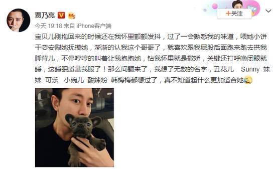 1月12日晚,贾乃亮晒出一张手抱小奶狗的自拍照,并发文称:“宝贝儿刚抱回来的时候还在我怀里颤颤发抖,过了一会熟悉我的味道,喂她小饼干,安慰她抚摸她,渐渐的认我这个哥哥了,就喜欢跟我屁股后面跑来跑去拱我脚背儿,不停哼哼的叫着让我抱抱她,钻我怀里就是撒娇,关键还打呼噜闭眼就睡,这睡眠质量我服了!那么问题来了,我想了无数的名字,丑花儿、Sunny、妹妹、可乐、小碗儿、酸辣粉、韩梅梅都想过了,真不知道起什么更加适合她。”