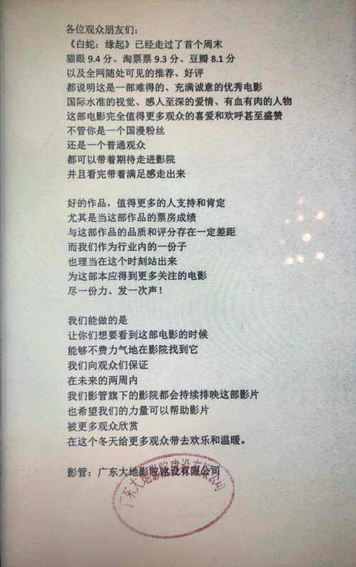 今日,大地影院集团(以下简称:大地影院)发布公开信,在给予《白蛇:缘起》品质充分认可的同时,也宣布将在未来两周内,维护影片在大地影院的场次占比,以等候更多观众走进影院欣赏这部电影。