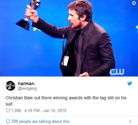 据台媒报道 第24届评论家选择奖于14日举行颁奖典礼,男星克里斯蒂安·贝尔以电影《副总统》夺下最佳男主角,没想到近日有网友发现,他当天上台领奖所穿的外套,还挂着一张类似信用卡大小的白色吊牌,非常显眼,引起了不少热议。