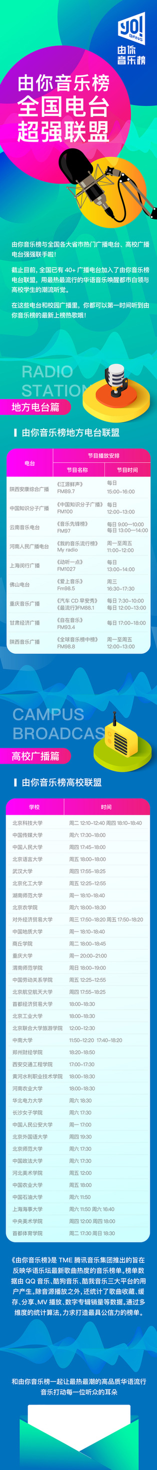 在合作的电台中不乏省级的广播电台与各省市名校所属广播站,诸如河南人民广播、重庆音乐广播、甘肃经济广播、陕西音乐广播、中国人民大学、武汉大学、中南大学、上海海事大学等。具体名单如发布图中所示,在名单中的电台和高校广播站都可以收听到由你音乐榜中最新最热的歌曲。