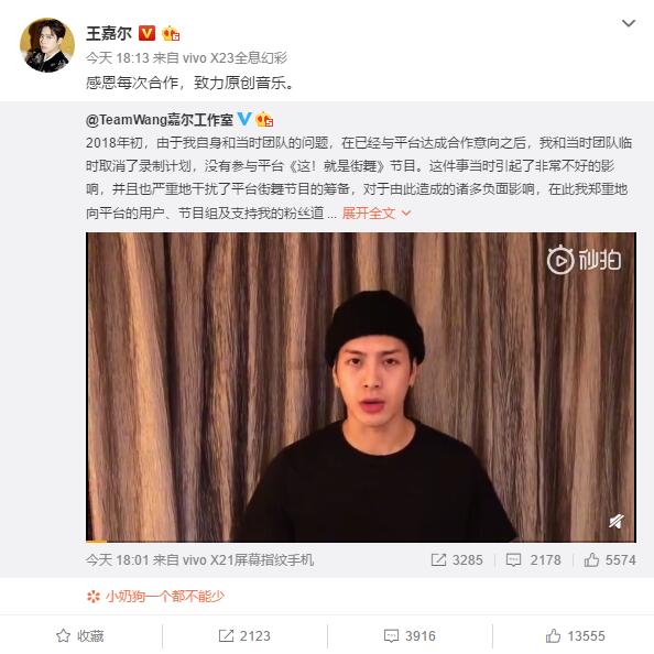 17日,王嘉尔工作室发道歉视频承认违约,达成合作意向后临时取消录制《这!就是街舞》节目,随后王嘉尔个人微博账户转发了此条视频,并配文“感恩每次合作,致力原创音乐”。全文:201