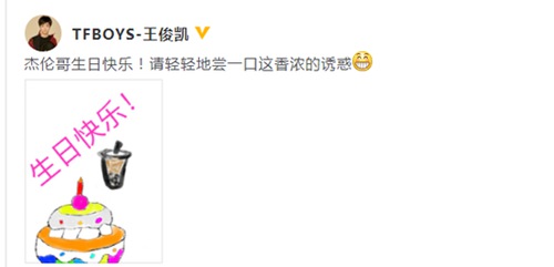 18日凌晨,王俊凯晒出一张手绘画为偶像周杰伦庆生,并配文:“杰伦哥生日快乐!请轻轻地尝一口这香浓的诱惑。”手绘画中不仅有大大的生日蛋糕,还有周杰伦最爱的奶茶,而且王俊凯还特意选