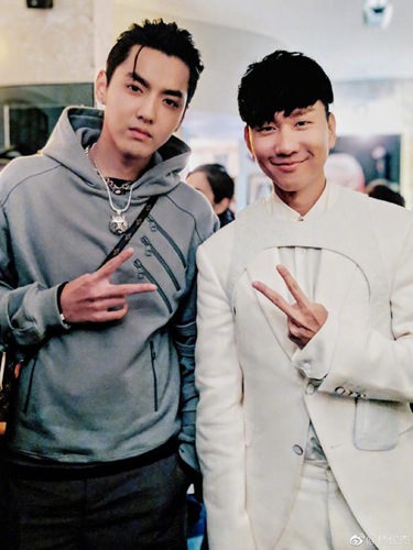 照片中吴亦凡身穿帽衫,斜挎小包,运动街头范儿十足,林俊杰身着白色西装,绅士优雅,俩人一起对着镜头比耶,十分帅气。