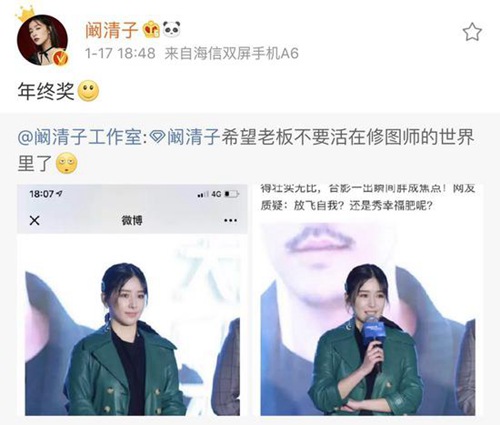 昨日,阚清子工作室发文发布两张新闻截图,并配文:“希望老板不要活在精修师的世界里了”。照片中,阚清子身穿墨绿大衣亮相某活动现场,身材在未修图里较之前圆润了许多。此条内容发布后,立即得到了网友们的围观与热议。阚清子也在当天晚些时候转发此条内容,并回复称:“年终奖”。短短的三个字令人忍俊不禁,也引发了无数吃瓜群众的遐想。网友们纷纷表示:“哈哈哈工作室太皮了年终奖凉凉”、“年终奖是和老板一起幸福的变胖”。