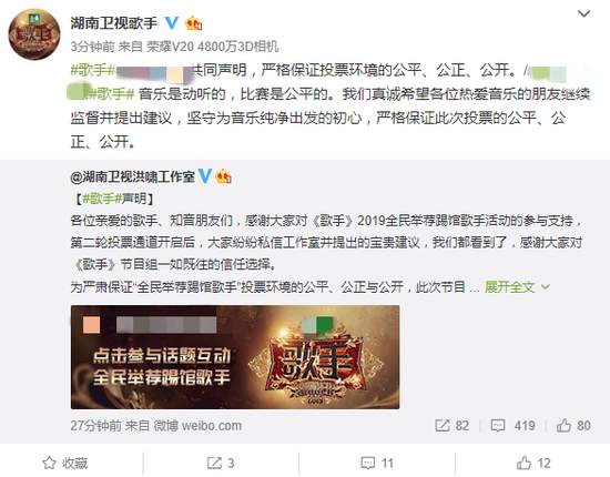 1月20日,《歌手》节目组就刷票行为发布声明,表示将严肃进行清票处理。