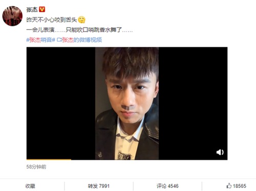 1月20日下午,张杰在微博发布一则视频,视频中张杰称自己即将参加活动唱歌却把舌头咬伤了,还开玩笑称:“只能吹口哨跳香水舞了”。