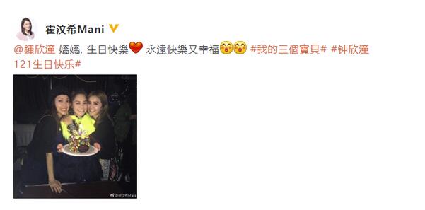 1月21日是钟欣潼38岁的生日,零点时分,经纪人霍汶希就晒出阿Sa和容祖儿为其庆生的照片,并送上自己的祝福:“娇娇,生日快乐,永远快乐又幸福。”霍汶希还表示阿Sa、阿娇和容祖儿