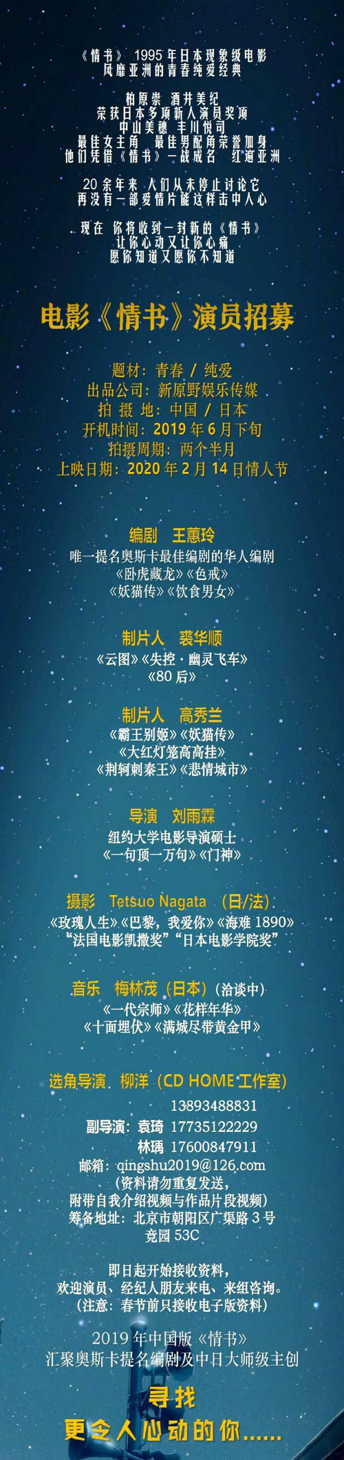 1月20日,据片方发布的招募图片信息透露,经典电影《情书》将翻拍中国版,由刘震云的女儿、青年导演刘雨霖执导,王蕙玲担任编剧,演员阵容尚未确定。目前网上有营销号表示已知晓该片主演阵容,男主拟邀陈飞宇,