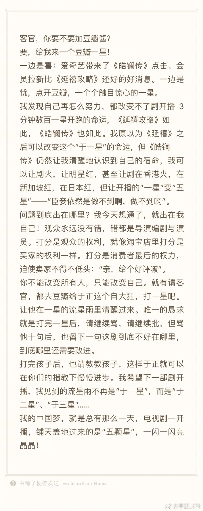 1月22日,于正在微博发文,回应新剧《皓镧传》遭疯狂打一星的情况。他称“问题到底出在哪里?我今天想通了,就出在我自己!观众永远没有错,错的都是导演编剧与演员。打分是观众的权利……你不能改变所有人,只能改变自己……唯一的恳求就是打完一星后,请继续骂,请继续批,但骂他十句后,也留下一句这剧到底不好在哪里,到底哪里还需要改进”、“我的中国梦,就是总有那么一天,电视剧一开播,铺天盖地过来的是‘五颗星’,一闪一闪亮晶晶。”