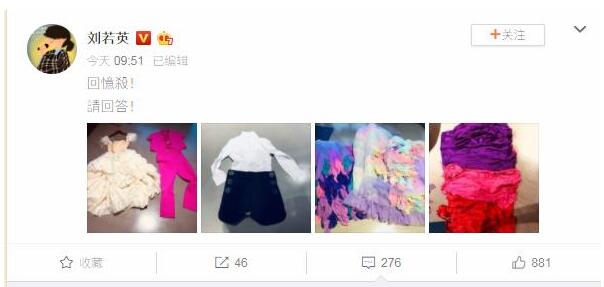 1月22日上午,“奶茶”刘若英在个人社交网站上晒出几张旧时的戏服,并俏皮提问网友称:“回忆杀!请回答!”。刘若英晒图照片中的三套衣服略有年代感,但还是被