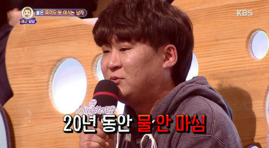 韩国综艺节目《大国民脱口秀-你好》常有民众上节目分享烦恼,日前一位30岁的男性,带来自己29岁的友人,烦恼的说:“20年来从来没有看过他喝过水,不论是口渴、咳还是吃药,都绝对不会喝水。”甚至吃药配的是可乐,面对劝说也只是回答“死就死吧!”让朋友非常担心。