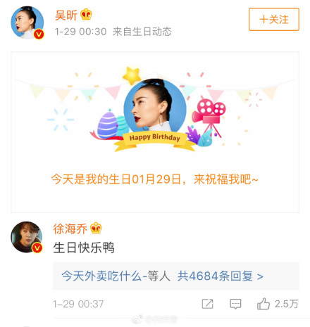 今天是吴昕36岁生日,凌晨徐海乔掐点为吴昕送祝福庆生。此前,徐海乔与吴昕因在综艺《我家那闺女》中互动有爱,CP感爆棚而引发热议, 甚至被不少网友催“在一起”。对于今日徐海乔掐点