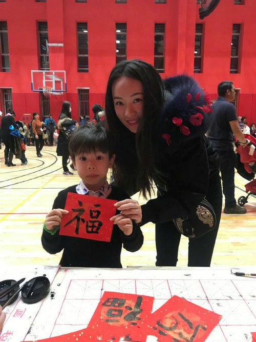 照片中,霍思燕紧紧搂住儿子的肩膀,嗯哼手上则拿了一张福字,瞪大了眼睛,表情很是呆萌。