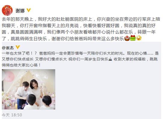 张杰通过微博晒一家四口全家福为双胞胎女儿庆生,称:“一年也太快了吧!?爸爸妈妈一定会更珍惜每一天陪你们长大的时光。现在的心情……是又想你们快点成长,又想你们慢点长大,祝你们一周岁生日快乐!收到大家的祝福啦,跳跳俏俏也给大家比心咯!”稍后,谢娜转发此微博并称:“去年的那天晚上,我好大的肚肚躺医院的床上,你兴奋的坐在旁边的行军床上陪我聊天,你打开窗帘指着天上的月亮说,快看快看好圆好圆,我说真的真的好圆,真是圆圆满满啊,我们像两个小朋友看啥都开心说什么都在乐,转眼一年了,跳跳俏俏生日快乐,谢谢你们给爸爸妈妈带来这么多快乐!”