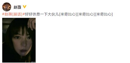 1日晚,赵薇通过微博晒素颜自拍照,并配文称:“好好休息一下大伙儿。”照片中,赵薇一脸素颜,留着长长的头发,久违的齐刘海,一手撑着头,清纯似少女。网友被此美照迷倒,纷纷围观并留言称:“你也好好休息,前些日子太辛苦啦!”“久违的齐刘海!”“这个打扮是暗黑甜美女魔头吗?”