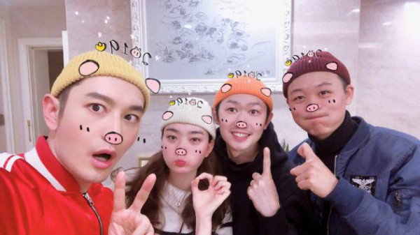 照片中,黄晓明和其余三名工作人员戴着绒线瓜皮帽,一起对镜搞怪卖萌,还P上小猪的鼻子,十分的可爱有趣。