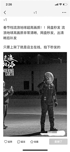 2月8日上午,北青报记者调查发现,上映第四天,网上已有不少卖家在叫卖《流浪地球》影片资源,声称是“高清完整版”,售价低至1元。