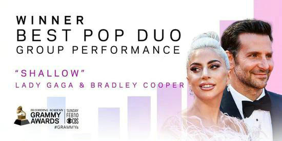 Lady Gaga再获格莱美大奖!Gaga和布莱德利·库珀凭借《一个明星的诞生》主题曲《Shallow》获得第61届格莱美最佳流行组合/二人组,这是今晚Gaga获得的第三座格莱美,也是她第9座留声机。