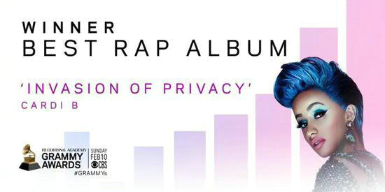 Cardi B冠军专辑《Invasion Of Privacy》获得第61届格莱美最佳说唱专辑。