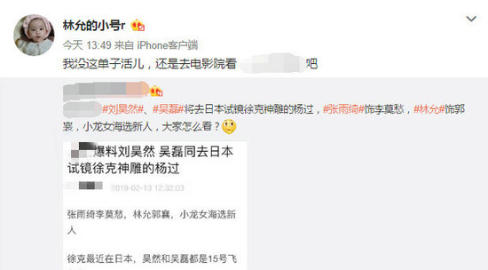 2月13日,林允小号转发了该微博,直接了当地否认:“我没这单子活儿。”