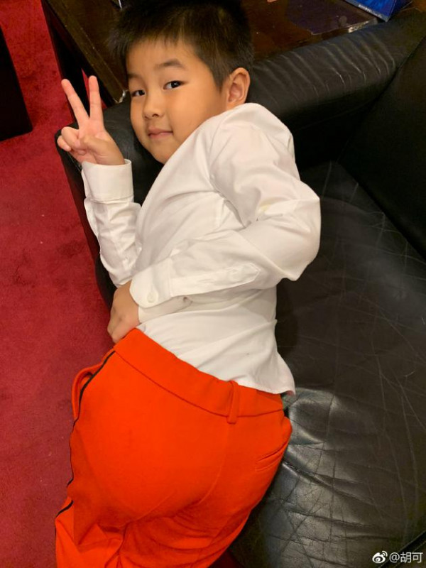 2月18日凌晨,胡可在微博晒出一张儿子小鱼儿的萌照道晚安,写道:“婀娜的道一声~~晚安。”照片中小鱼儿穿着白色衬衣红色长裤,半躺在沙发上扭头对镜比耶,“翘臀&rdq