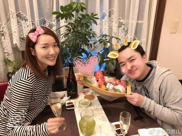 照片中,李亚男展甜美微笑,露出小酒窝,温柔可爱;老公王祖蓝则举着一盘日料对着镜头微笑,画面十分甜蜜。