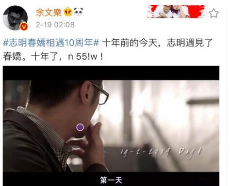 2月19日凌晨,余文乐晒出电影《志明与春娇》中志明与春娇第一次相遇的截图,并配文:“#志明春娇相遇10周年# 在十年前的今天,志明遇见了春娇。十年了,n 55!w ! ”