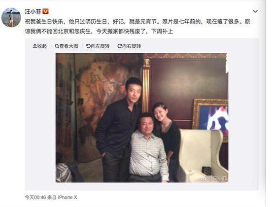 2月20日凌晨,汪小菲晒照为父亲庆祝生日,并配文:“祝我爸生日快乐,他只过阴历生日,好记,就是元宵节。照片是七年前的,现在瘦了很多。原谅我俩不能回北京和您庆生,今天搬家都快残废了,下周补上 。 ”