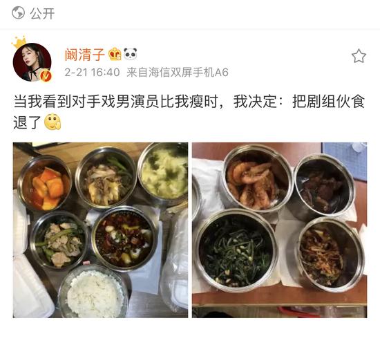 昨日,演员阚清子于社交平台发文称:“当我看到对手戏男演员比我瘦时,我决定:把剧组伙食退了。”并配了两张餐饭图片。照片中,菜式齐全十分丰富。此前,阚清子就曾易胖体质及&ldquo