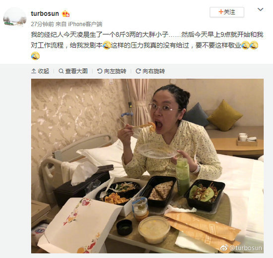 孙俪原文:我的经纪人今天凌晨生了一个8斤3两的大胖小子……然后今天早上9点就开始和我对工作流程,给我发剧本,这样的压力我真的没有给过,要不要这样敬业。
