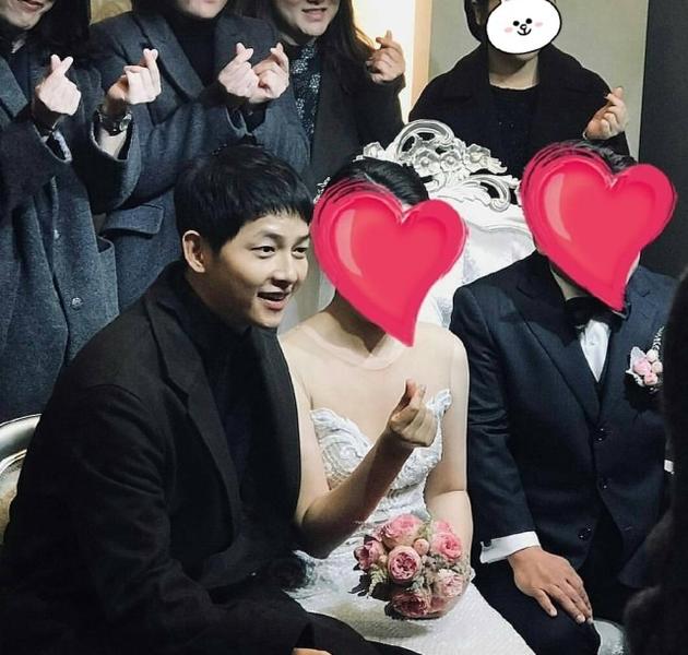 宋仲基出席朋友婚礼 26日,有网友爆料刚度完蜜月回来的宋仲基被发现参加了朋友的婚礼,当时宋慧乔并未一同前往,只有宋仲基一个人和新人合影。不知道是不是婚后生活甜蜜,照片中的宋仲基似乎胖了不少。网友也纷纷