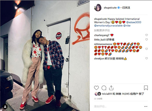 3月10日,秦舒培晒出一张和陈冠希亲密合影大秀恩爱,并配文:“迟来的国际妇女节快乐”。照片中秦舒培双手插兜,陈冠希同样双手插兜,但他头枕秦舒培的肩膀,一脸甜蜜。