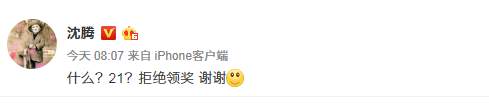 17日,沈腾发微博搞笑回应了自己上榜近日亚太区最帅面孔100人评选,并获得21位的事:“什么?21?拒绝领奖 谢谢!”看来沈叔叔对自己21的排名不是特别满意,野心不小啊。这样大胆露骨的回应估计也只有戳中万人笑点的沈叔叔了。