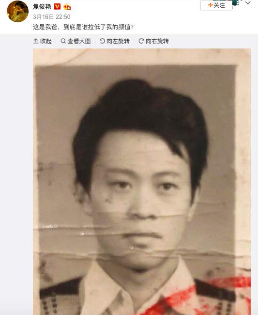 焦俊艳微博晒爸爸青涩旧照 意外撞脸魏大勋
