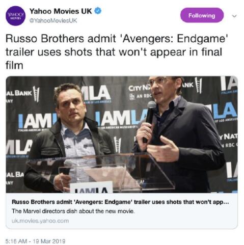 为保持惊喜?罗素兄弟称《复联4》预告不出现在正片中