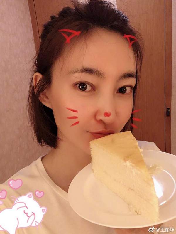 3月22日是王丽坤的生日。她在微博晒出一张照片,配文称:“嗝,蛋糕吃饱了。”照片中,王丽坤一手端着一碟子蛋糕,穿着休闲居家的白T恤,脸上加上了猫咪贴纸显得可爱十足,俏丽又活泼。