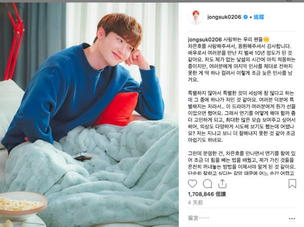 李钟硕8日正式以替代役身份入伍,他在服役后的10天,18日在Instagram贴出道别文,成为演员与大家见面已经经过了10个岁月,他也还在适应自己不在的时间,当兵以来,他没有好好与粉丝道别,因此决定贴出这段贴文,“这个世界上有很多因为不特别却变得特别的事,而我似乎就是其中一个,托大家的福,我才变得特别。”同时他也希望戏剧《罗曼史是别册附录》成为给粉丝的道别礼物,他在剧中尝试穿多变的衣服、发型,虽然再度回顾作品时,仍带点遗憾。